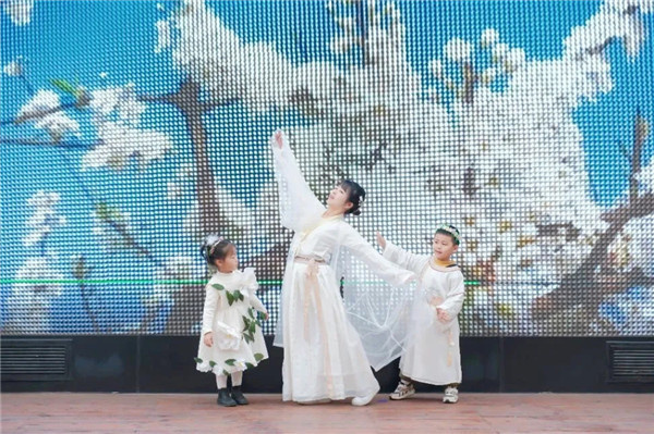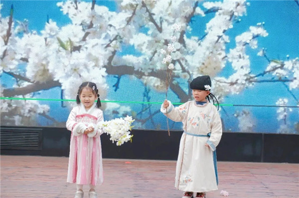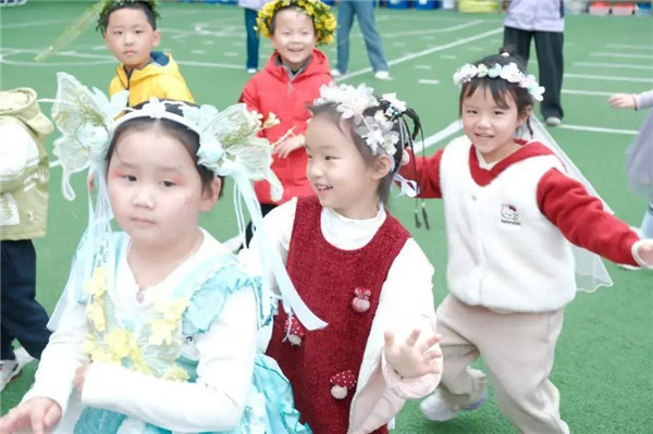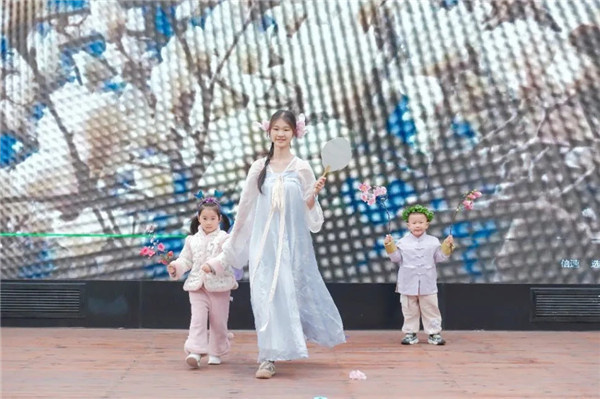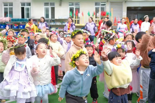 最令人期待的,当属师幼节目《花神秀场》。各班萌娃化身小小花神,身着精致的花神装扮,与扮演十二花神的老师们一同登台,迈着灵动的步伐,款款走来。桃花灼灼、李花素雅、樱花烂漫……孩子们或浅笑嫣然,或揖礼而行,一步一景,皆是诗意,将花神的风姿演绎得童趣盎然,成为春日里最耀眼的风景。