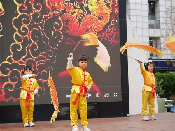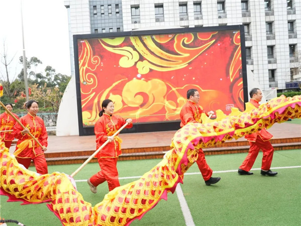热身过后,师幼舞龙队惊艳登场,孩子们化身“金龙”率先开场,瞬间点燃了全场的热情。紧接着教师舞龙队登场,双龙昂首摆尾,穿梭腾跃,双龙戏珠精彩绝伦。龙身翻飞间,舞出了春日的蓬勃生机,舞出了武侯十三幼的昂扬风貌,更将传统民俗的魅力传递给每一个孩子,让传统文化在欢声笑语中浸润童心。