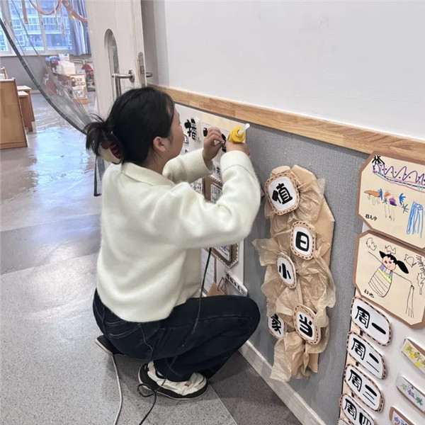 老师们结合幼儿年龄特点,巧思创设班级及公共区域环境。从主题墙布置、区域材料投放到色彩搭配、童趣设计,层层推进、精心打磨,让环境成为无声的教育者,为孩子们打造出兼具探索性与趣味性的成长乐园。