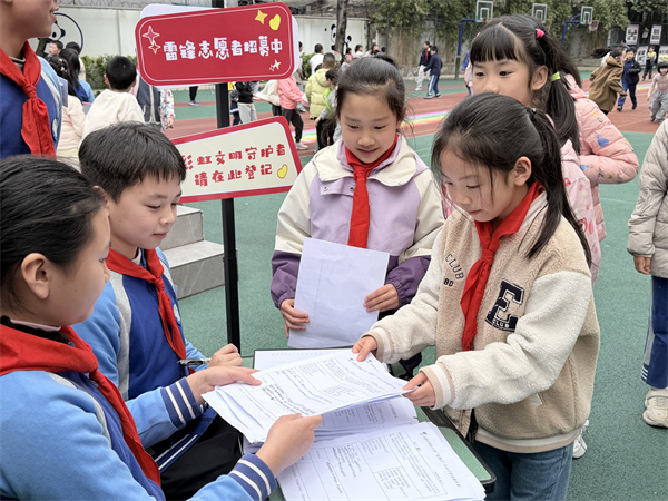 “学雷锋日”当天,新一届“彩虹小雷锋·文明守护者”组织进行现场招募,“我希望成为文明守护者,像雷锋叔叔那样,从小事做起,为同学服务。”一位少先队员的发言道出了许多孩子的心声。“守护者”们将承担文明纪律、环境卫生等日常监督,把对榜样的崇敬转化为守护校园的实际行动。从被守护到守护他人,这是一次身份的转变,更是一次精神的接力。