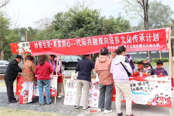 学雷锋,不止于校园,更融于社区。在武侯区委社会工作部的号召下,3月2日,武侯十三幼积极参与武侯区“学雷锋做志愿,共同奋进‘十五五’”志愿服务游园活动,在丽都花园社区党群服务中心外广场设立“妙剪生花·育美润心”特色摊位,将传统手工文化与雷锋志愿精神深度融合,开展代际共融的文化传承志愿服务。活动现场,幼儿园剪纸社团的孩子们化身小小志愿者,专注地剪窗花、做手工,他们的巧思与创意吸引了众多社区居民驻足。不少社区的爷爷奶奶也加入其中,与孩子们一同体验剪纸的乐趣,在一问一答的交流中、一折一剪的创作里,搭建起老少对话的桥梁,让传统文化在代际互动中薪火相传。