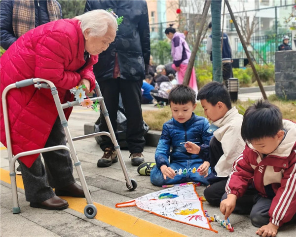 紧接着的画风筝、放风筝环节,孩子们与爷爷奶奶一同来到武侯吉福院的花园中温馨互动。大手牵小手,祖孙俩携手执笔,五彩的颜料在空白风筝上肆意挥洒,一朵朵春花、一只只飞鸟跃然纸上,将春日的美好与童真的想象尽数勾勒。