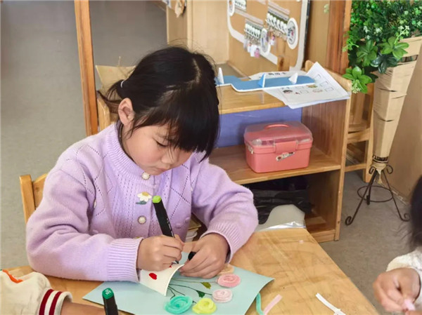 孩子们又悄悄忙碌起来了。彩纸铺开,剪刀握紧,胶水备好。“送给妈妈一束花,祝妈妈妇女节快乐。”有的低着头,画了一朵歪歪扭扭的小花,花蕊里藏着“妈妈我爱你”;有的认真折着纸,折了又拆,拆了又折;有的要将说不出口的爱意全都装进信封。小手忙忙碌碌,眼睛亮晶晶的。每一笔,都是说不出口的“谢谢您”;每一折,都是藏在心里的“我爱您”。
