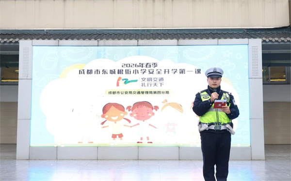 交通安全是校园安全的重要组成部分,为增强师生的交通安全意识,培养文明出行的良好习惯,2026年3月3日,成都市东城根街小学携手交警四分局开展新学期“交通安全开学第一课”主题活动,将文明交通的理念传递给每一位孩子,为学生的平安成长保驾护航。