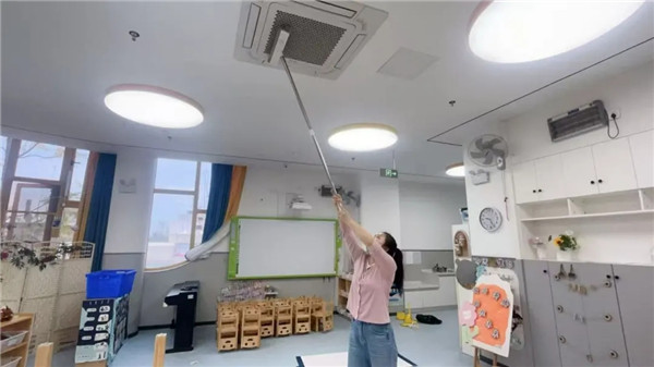 为有效防止传染病的传播,幼儿园保健人员对园内环境和物品常态化卫生消毒工作进行严格监管:每日对幼儿接触的玩具、教具进行浸泡或擦拭消毒;定期将图书、毛绒玩偶等进行日晒消毒;严格执行餐具一用一消毒制度,对疑似病例班级的餐具进行单独煮沸消毒,确保饮食安全;每日定时对教室、走廊、卫生间等公共区域进行清洁和预防性消毒,保持室内空气流通。