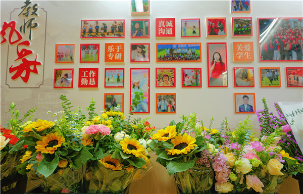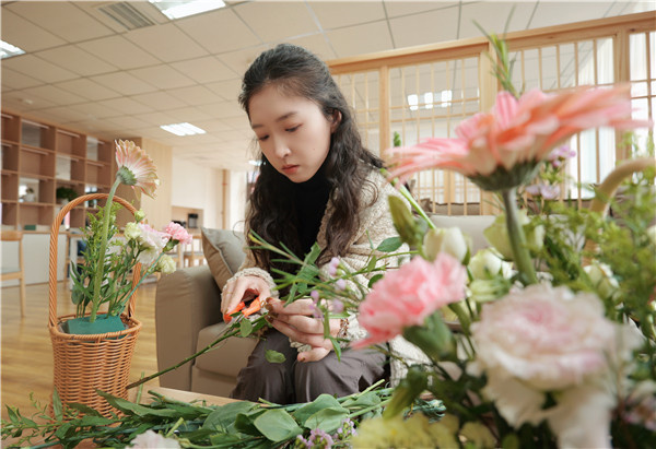 在花艺创作区,鲜花的清甜芬芳扑面而来。在专业花艺导师的指导下,平日里执笔耕耘的老师们化身为“生活艺术家”,专注地修剪、搭配、构思。她们以向日葵、洋甘菊寓意“向阳而生”,用玫瑰、铃兰诉说“绽放”的期许,将康乃馨、洋桔梗等花材巧妙组合,赋予自然新的艺术生命。一修一剪之间,不仅是花艺作品的诞生,更是忙碌心灵的一次沉静与滋养。