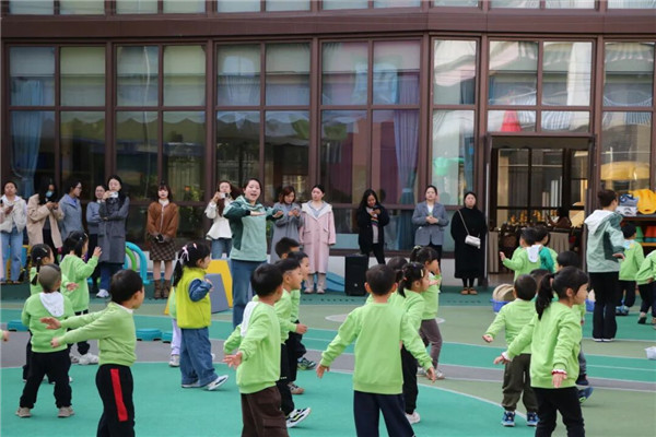 随后,老师们来到操场,观摩中班联合早操。伴随着欢快的音乐,孩子们精神饱满地入场。早操编排融入了游戏化、情境化元素,将基本动作锻炼与同伴协作有机结合。