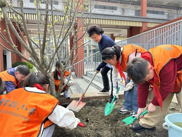 “桥娃娃们”们来到户外种植区,真正体验植树的乐趣。大家手持小铁锹,挖坑、扶苗、填土、浇水,每一个步骤都有条不紊,动作认真得像个小园丁。