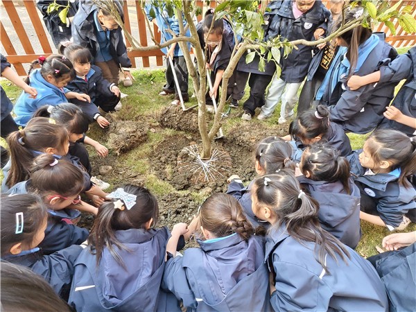 3月11日上午大课间,一年级的师生们迎来了一场特别的“添绿仪式”。在班主任和辅导员的带领下,孩子们带着铲子、水桶等工具,来到一号楼架空层旁的草坪,亲手种下学校统一购买的果树苗。挖坑、扶苗、培土、浇水……每一个步骤都认真细致,每一棵小树都承载着孩子们对绿色校园的美好祝愿。