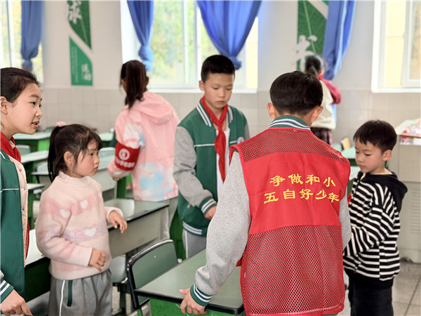 结合学生实际需求,温江区和盛小学组建校内志愿帮扶小组,引导六年级志愿者主动到一年年,开展“大手拉小手”教室卫生清理活动。