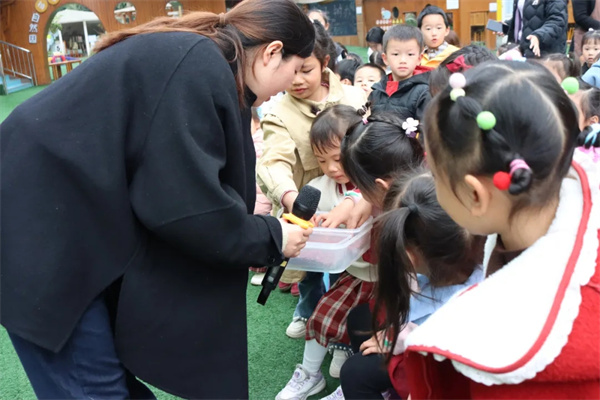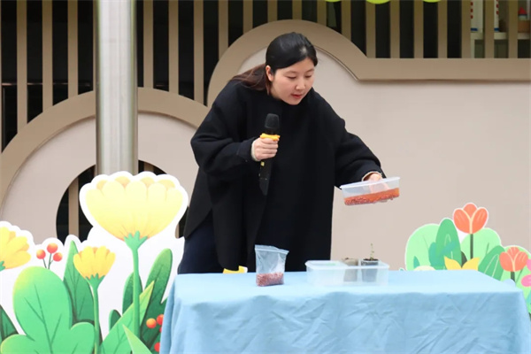 朱慧老师开展“种子变变变”科学探究活动,现场演示干种子与泡涨种子的对比实验,让孩子们亲手触摸、近距离观察,直观感知两种种子的形态差异,同时细致讲解种子发芽的必备条件和春耕播种的小知识,耐心解答孩子们的奇思妙想。