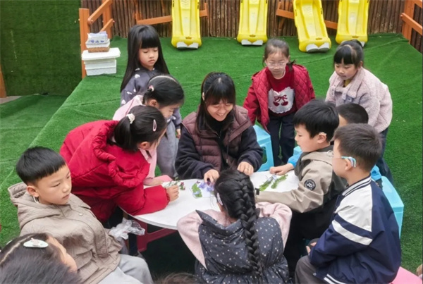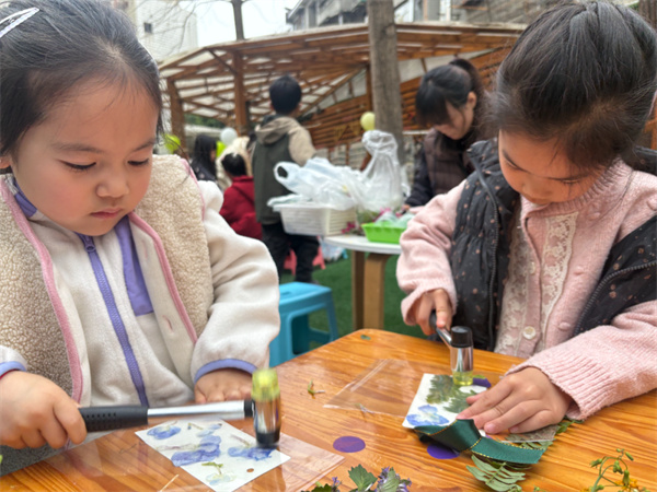 春日手作组则围绕春日主题尽情发挥想象力与动手能力,家长和老师在旁贴心指导、暖心配合,和孩子一起创作。大家有的做春日串珠、有的玩植物拓印、有的绘春日图画,还有的捏制黏土春芽、剪贴花草盆栽……一边创作一边相互分享奇思妙想,小小的创作区里创意涌动,每一件作品都藏着孩子们对春日的美好想象,也饱含着亲子间的温馨美好。