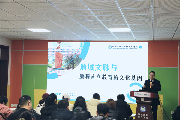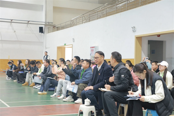 王刚以《直立教育理念下学校体育文化建构的鹏程实践》为题开展专题讲座,结合学校实践案例,深入阐释体育与思政融合的育人理念。他指出,体育课堂是思政教育的重要阵地,要将国防意识、家国情怀、拼搏精神与规则意识,有机融入体育教学、赛事活动与校园体育文化中;以体育为载体,让生命、智慧、文化浸润学生成长,实现“以体育人、以体铸思政”的育人目标,在场教师认真聆听、深感受益。