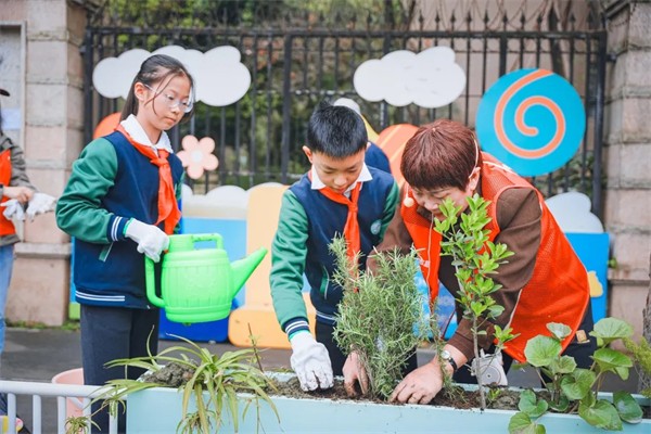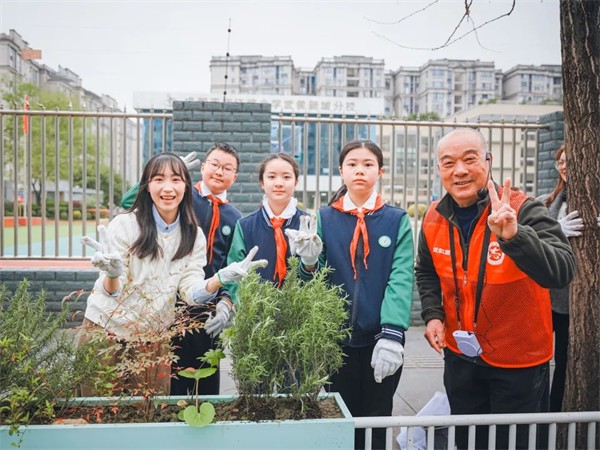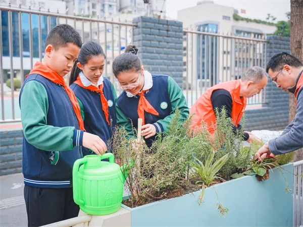 随后,“五老”志愿者与党、团员志愿者带领少先队志愿者投入到热火朝天的劳动中。孩子们学习种植、养护,体验到劳动的艰辛与光荣;“五老”志愿者与党员、团员志愿者倾囊相授、以身示范,传递了奉献、友爱、互助、进步的志愿精神。这正是“锦”新共育的深意——用匠心培育新苗,用爱心培育新人。