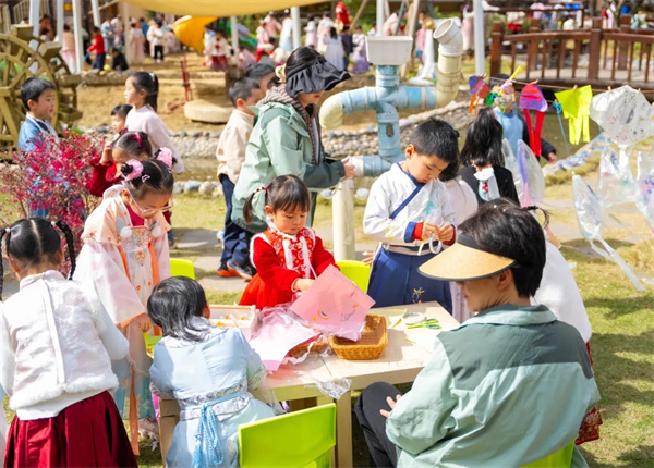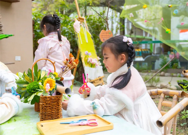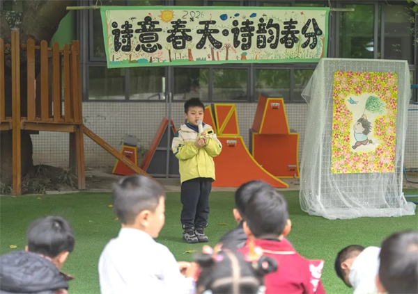课例展示结束后,与会人员走进户外区域,观摩春分习俗体验活动。种植园里,孩子们寻种培土,沉浸式体验春耕劳作的乐趣;大榕树下,他们围坐吟诗,玩转春日诗词飞花令;木工坊中,他们巧手创作,自制“城厢过街连箫”……爱国、友善、和谐等社会主义核心价值观在润物无声的体验中悄然浸润。