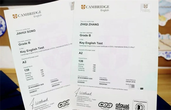 重磅喜讯!备受期待的剑桥英语等级考试纸质证书,已正式送达成都蓝港外国语学校2025年11月29日首场考试学员手中!一张张沉甸甸的证书,不仅是对孩子们努力的最好见证,更是蓝港外国语学校作为剑桥英语官方考点的首次荣耀答卷!
