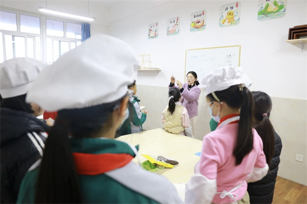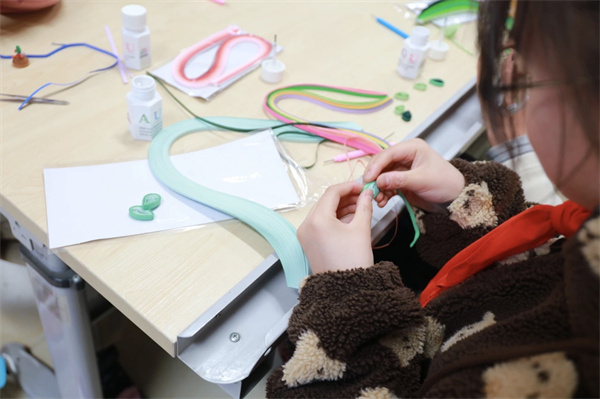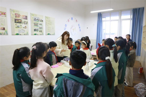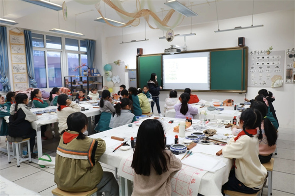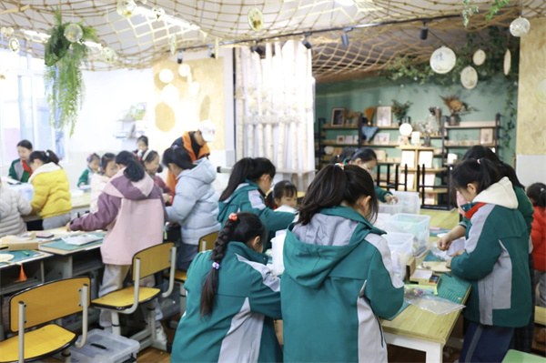 书法社里,孩子们握着毛笔,一笔一画地写着,墨汁在宣纸上晕开,淡淡的墨香飘在空气里。水墨童趣社团的小画家们蘸着颜料涂涂抹抹,有的画小猫,有的画月亮,每一张画都有自己的故事。竹编社的孩子们手指翻飞,竹条在手里变成小篮子、小扇子,做完了就拿给老师看,等着被夸一句“真巧”。蜡染社的孩子们学着扎染,白布在手里折来折去,浸进染缸,再展开时,每一块布上的花纹都不一样。版画社的孩子们跟着王老师拓印,油墨滚过木板,纸上一压,图案就出来了,每个人都像变了个小魔术。丙烯画社的娃们拿着画笔,在画布上涂满鲜艳的颜色,花朵、星空、卡通形象,亮得像把彩虹搬进了教室。花艺社的孩子们学着修剪花枝,搭配颜色,压好的花朵夹进本子里,翻开来都是香香的。