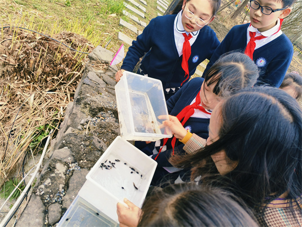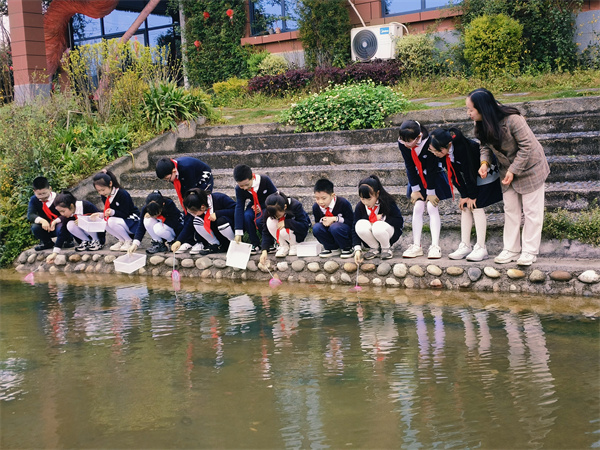 随后,大家来到河边,开启了一场与自然的亲密对话。孩子们化身“小小生态观察员”,认真学习水质检测方法,小心翼翼地操作检测工具,记录下每一组数据,直观感受河流生态的变化。河边的浅水区里,小蝌蚪在水中灵动游动,孩子们驻足观察,轻声讨论着它们的生长变化;大家还亲手将鱼虾放生,看着小鱼小虾欢快地游向河水深处,脸上满是喜悦与期待,也在心中种下了爱护自然、守护生态的种子。