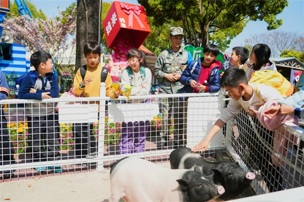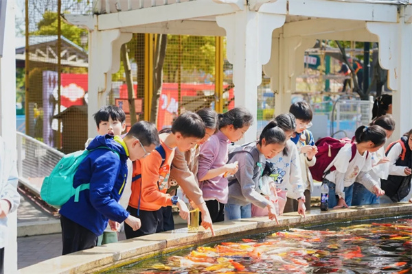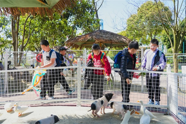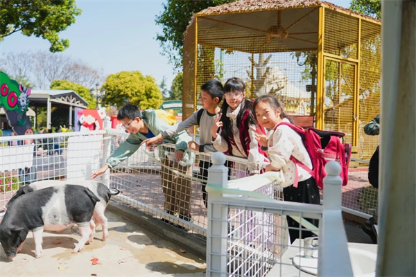 紧张刺激的项目之后,同学们来到萌宠乐园,节奏在这里慢了下来。憨态可掬的小猪、悠闲散步的孔雀、呆萌的羊驼,还有五颜六色的锦鲤,让同学们露出了温暖的笑容。大家隔着围栏轻轻抚摸小动物,感受着与这些小生命相处的温柔时光。从高空挑战到与萌宠互动,同学们在这一张一弛之间,体会着世界的多元和丰富。