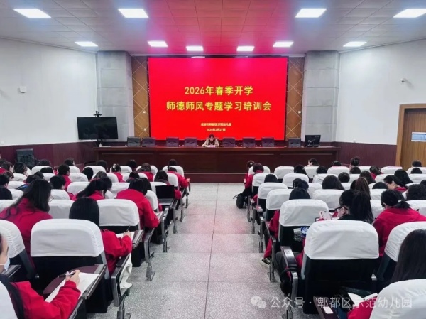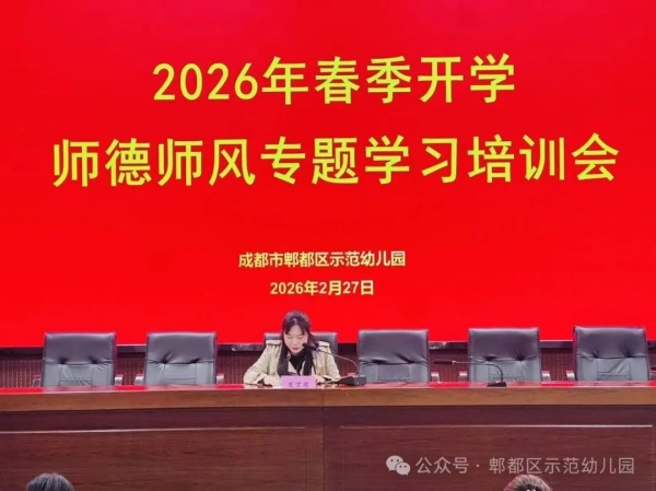 新学期伊始,为加强师德师风建设、提升教师职业道德水平,郫都区示范幼儿园在党支部书记、园长罗小林牵头部署下,于2026年2月27日组织集团五园区召开全体教职工大会暨师德师风建设动员大会。党支部副书记陈悦对新学期师德师风工作进行全面部署与动员,明确师德建设目标、工作要求与重点任务,引导教职工统一思想、压实责任,以优良师德师风开启新学期工作。