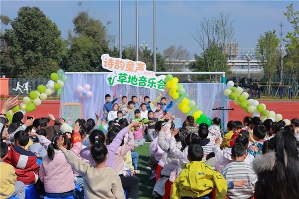 音乐会尾声,孩子们齐声共唱《咏鹅》,清脆童声伴着诗韵在校园里飞扬。一个个小身影挺拔而立,欢快旋律与春日暖风交织,将春光定格在龙江路小学双流分校的草坪上。