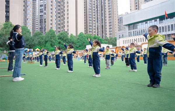 午操锻炼中,孩子们精神抖擞,动作整齐有力,在欢快的音乐中展现出健康的体魄和自信的笑容。每一个跳跃、每一次伸展,都折射出孩子们在运动中的自信与成长,孩子们蓬勃的朝气给在场专家和老师们留下了深刻的印象。