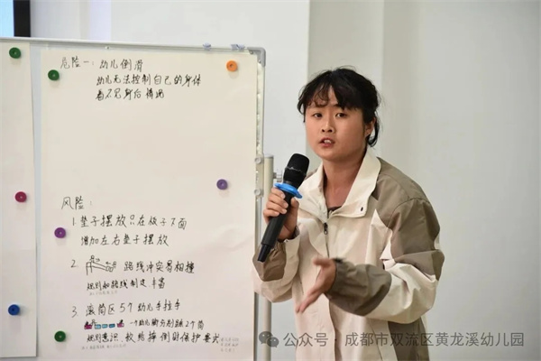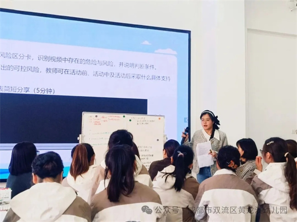 随后,双流区机关幼儿园党政办副主任杨丹带领幼儿园教师围绕“安全与成长,如何平衡?”这一核心议题展开了热烈的小组辩论。这一过程,让理念之争落到了可操作的判断框架中。大家逐渐达成共识:真正的平衡,不是二选一,而是在筑牢安全底线的基础上,科学识别、渐进支持,让孩子在可承受的挑战中获得发展。