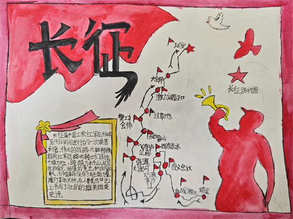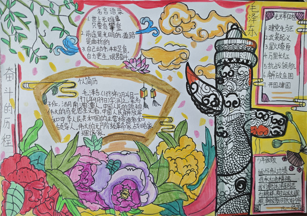 活动启动后,同学们积极响应,自主选择革命先辈、时代楷模或重大奋斗历程作为研究主题,广泛搜集相关故事、图片。在老师的指导下,大家运用阅读方法提炼核心内容,结合美术创意完成A4图文小报,将抽象的奋斗精神转化为生动直观的视觉作品。