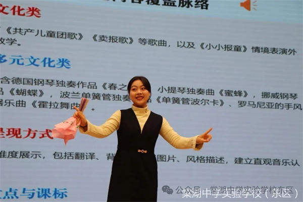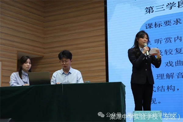 3月19日下午,由成都信息工程大学红樱实验学校音乐组教师聚焦五、六年级高段学科目标进行第三阶段解读,三位老师以《循课标而学 以美育而教 向课堂而行》为主题分享。老师们从对应课标、关联内容、聚焦素养、导向实践、以评导学五大板块解读教材,结合单元案例与课例,明确高段学习任务、教学目标与活动设计,构建多元评价体系。