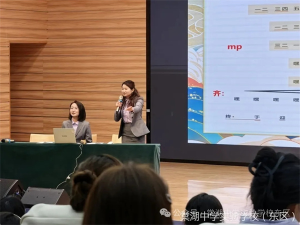 解读环节,学校音乐组教师姜晨、古樊、王元眸三位老师采用“实践到理论”的模式,不仅解读设计思路,邀请教师上台参与互动体验,让课标教材解读从“单向讲解”变为“全员参与”。老师们在轻松的氛围中直观感受如何将抽象音乐知识转化为孩子喜爱的游戏形式,现场俨然成为一堂生动的低段音乐课。三位老师还结合具体课例系统剖析低段教材——素养导向鲜明、主题化整合、游戏化设计、评价体系完善四大特点,将课标理念转化为可落地的教学行为,让核心素养融入低段每一节音乐课。