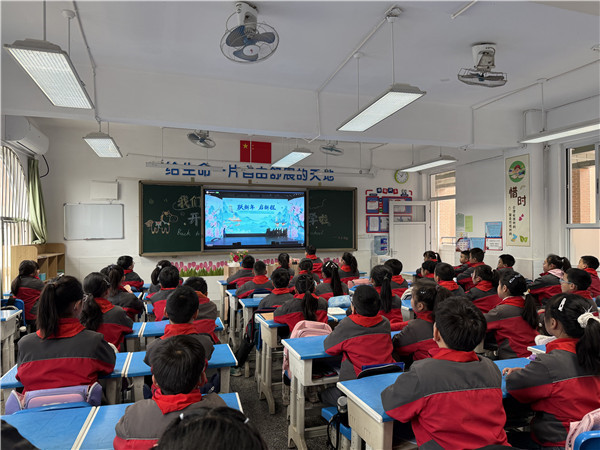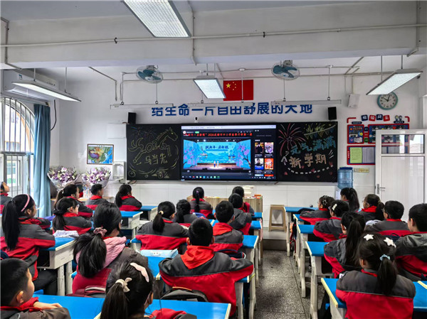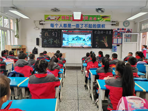最后,各班级在教室里观看成都市开学第一课直播。