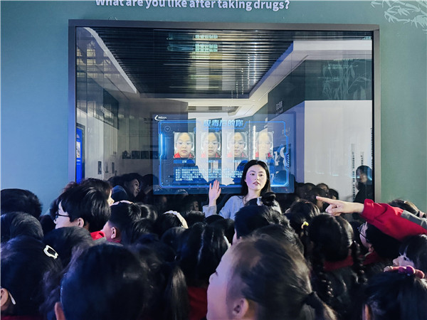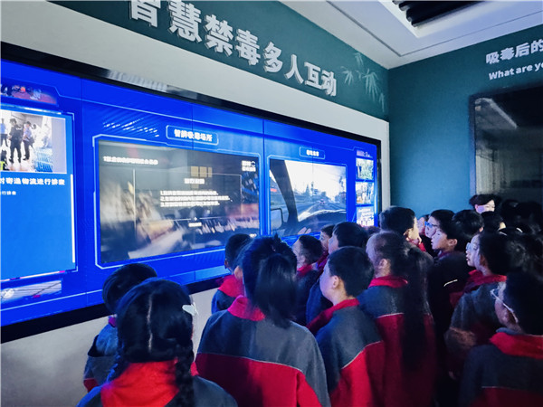 下午两点,同学们怀着好奇与期待的心情,在老师和基地讲解员的带领下,有序地进入教育基地展厅。一进入展厅,巨大的禁毒主题墙立刻营造出庄严肃穆的氛围。