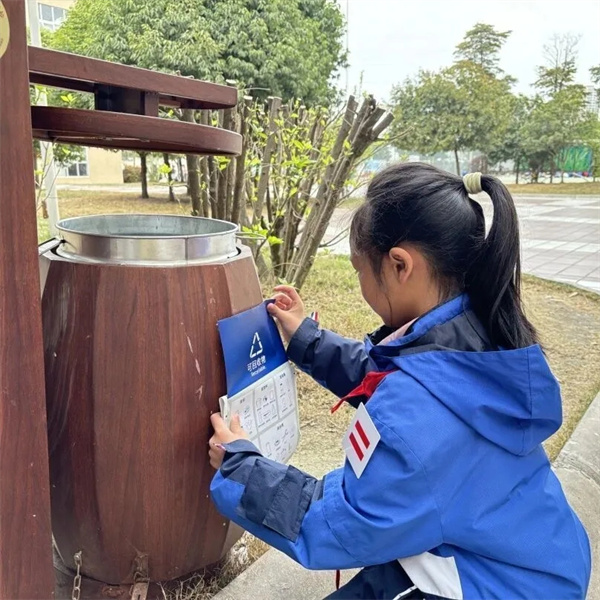 同学们与志愿者老师一同更新校园垃圾桶标识,营造浓厚的环保宣传氛围,让分类指引随处可见、随手可学。