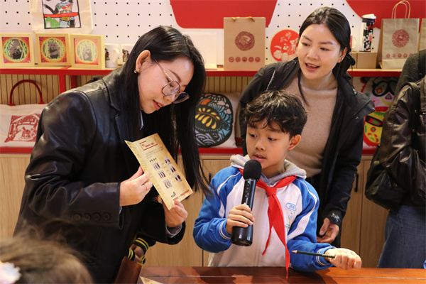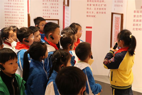 在博物馆馆长郝玉倩老师与学校学生讲解员团队的引导下,亲子家庭走进二楼剪纸博物馆,开启了一场非遗探秘之旅。小小讲解员们自信从容地为大家讲解剪纸的历史渊源、馆藏作品的创作理念以及非遗传承的故事,生动的讲解搭配精美的展品,让亲子家庭全方位感受剪纸艺术的独特魅力。大家不时驻足观赏、轻声交流,主动提问互动,在一问一答间,加深了对剪纸非遗文化的理解与热爱,也感受到了学校在非遗文化传承方面的用心与成效。