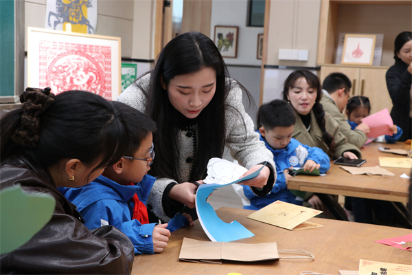 最令人期待的剪纸体验环节在剪纸工作坊拉开帷幕。学校剪纸非遗传承人吴佳钰老师作为实践课程指导,凭借专业的教学能力,为亲子家庭带来了生动细致的剪纸教学。家长与孩子相互配合、默契协作,指尖翻飞间,一张张普通的彩纸渐渐变成了形态各异的剪纸作品。随后,大家还将自己的剪纸作品装饰在文创纸袋上,制作出专属的非遗文创,让剪纸之美融入生活。