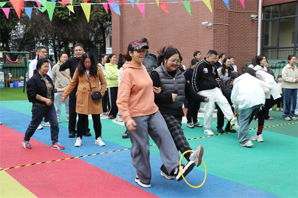 精彩的游戏环节正式开启,首先登场的是班级家长游戏《齐心脚勾圈·默契接力赛》。家长们化身游戏主角,以班级为单位展开比拼,两人一组用脚勾住呼啦圈接力前进,全程默契配合、齐心协力。