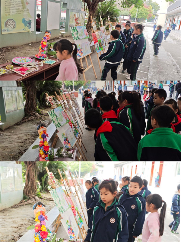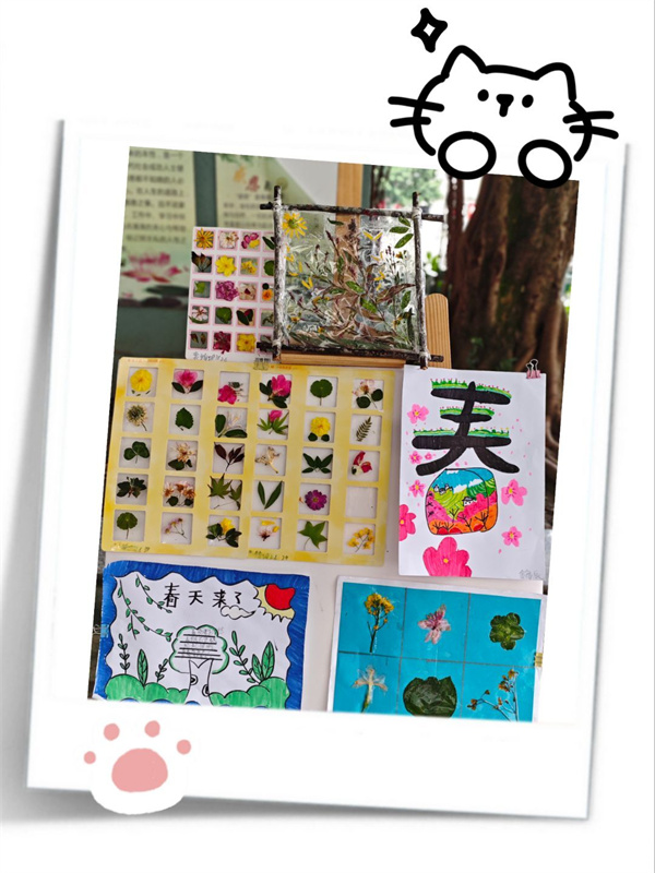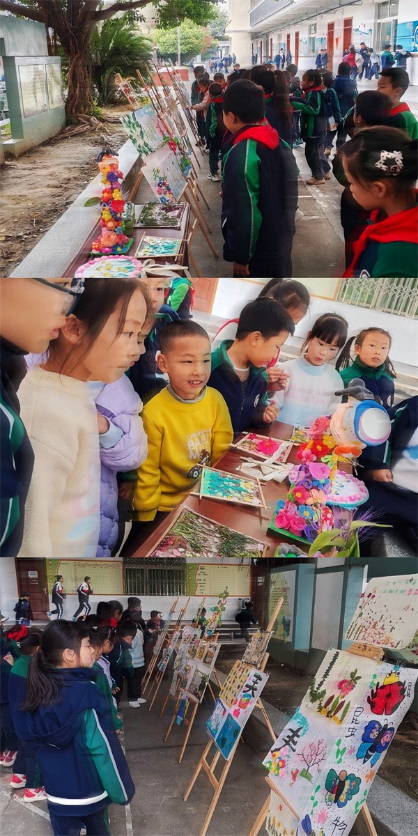 在班级评选的基础上,二年级组织开展作品集中评选。孩子们用嫩绿柳叶、粉嫩花瓣、形态各异的落叶,拼出灵动鲜艳的春景;用稚嫩的笔尖画出了油菜花、桃花等色彩明艳的春花,每一件都小巧精致,藏着对春天的喜爱。