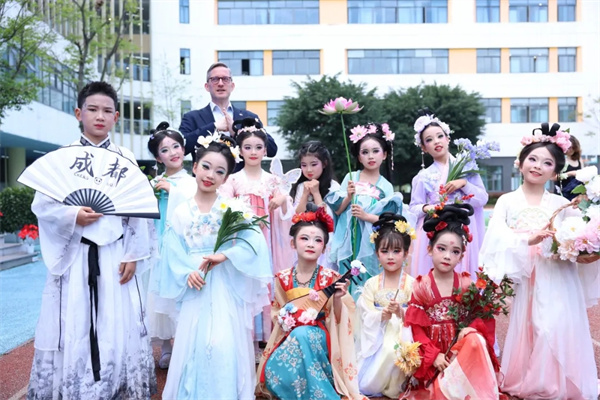 小学部操场上,独具巴蜀风情的欢迎仪式温情启幕,以最真挚的礼遇迎接远方来客。云芯学子身着华服带来十二花神国风展演,衣袂翩跹、气韵流转,尽展中华传统美学之韵;德国少年以一曲《天地龙鳞》活力起舞,铿锵舞步、蓬勃朝气,点燃全场热烈氛围,掌声与欢呼久久不息。