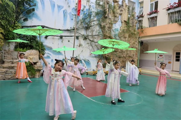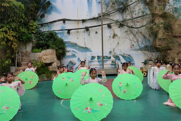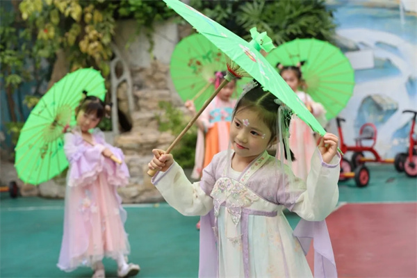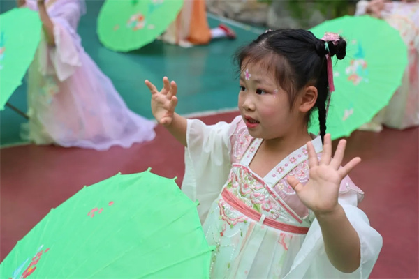 歌声落,诗意起,舞姿扬。孩子们用清脆的童声吟诵经典诗句,“草长莺飞二月天,拂堤杨柳醉春烟”“日出江花红胜火,春来江水绿如蓝”,字字句句饱含对春天的赞美。诵诗完毕,旋律轻起,大一班小朋友手持油纸伞翩然起舞,《上春山》舞蹈将春日的温婉与灵动展现得淋漓尽致。