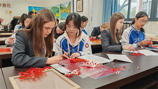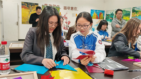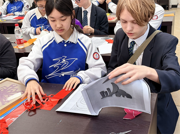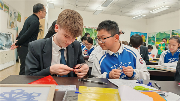 活动伊始,英国师生走进非遗课堂,沉浸式体验剪纸与竹编的艺术魅力。中英学生围坐一堂,在老师们的耐心指导下,大家手持剪刀,专注地剪出精美的窗花图案;一根根柔韧的竹篾在指尖巧妙穿梭,渐渐编成精巧可爱的挂件。指尖流转间,东方美学的精巧与智慧悄然浸润心田。裁剪与编织的间隙,同学们自然聊起学习日常与生活趣事,一场跨越国界的对话,在“指尖艺术” 的陪伴下温暖展开。