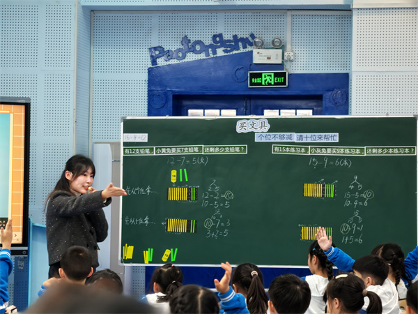 活动中,胜西文兴分校王存老师执教的研究课《买文具》,紧扣新教材理念,以20以内不退位减法速算巧妙导入,迅速激活学生已有经验。课堂中,王老师精准捕捉“个位不够减”这一关键认知冲突,引导学生动手摆小棒,在“从哪儿拿、怎么拿、剩几根”的层层追问中,帮助学生自主明晰“个位不够减,请十位帮忙”的核心思路。课堂设计环环相扣,由浅入深,自然迁移至“二十几减几”的拓展思考,形成了完整的“学—思—悟—用”学习闭环。
