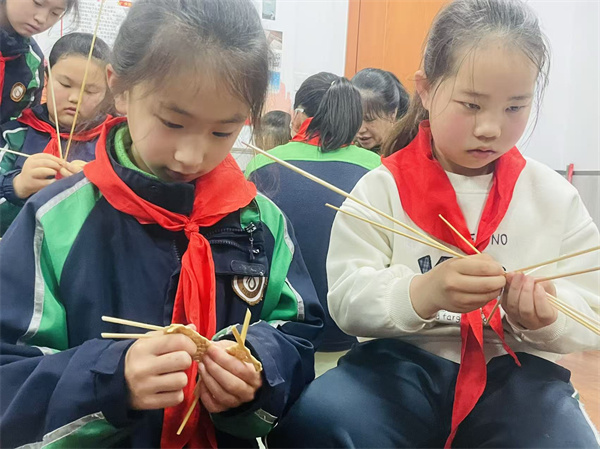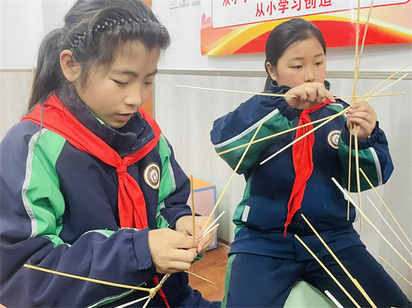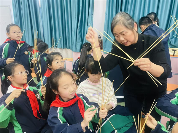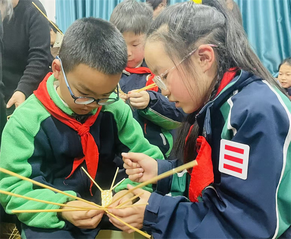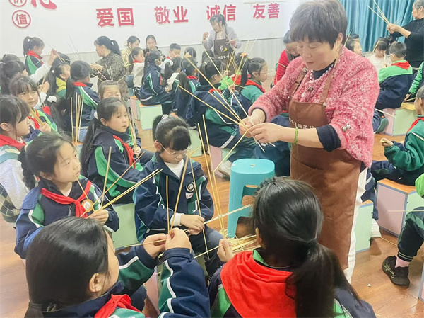 指尖翻飞,普通麦秆被赋予新的生命与活力。孩子们屏气凝神反复练习,每一次麦秆的弯折挑压,每一个认真专注的眼神和动作,都是他们对匠心的深刻体悟,对非遗技艺的致敬。从生疏到熟练,孩子们逐渐掌握“压一挑一”精髓,同伴互助,共同进步。