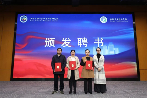活动现场,金牛区教育局副局长、区人民政府总督学阳莹艳为金牛区教科院教学改革实验中心(成都市友谊小学校基地)授牌,并为彭敏、曾欢、张敏等博士专家代表颁发聘书,正式组建教改中心的专家智库团队。