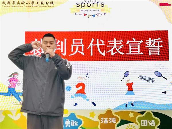 运动员代表以自信的姿态立下誓言,将尊重对手、服从裁判,竭尽全力参与每一项比赛,发扬“友谊第一、比赛第二”的优良传统,用汗水书写少年风采。