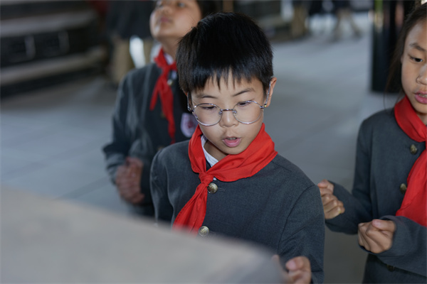 随后,在刻着“在家尽孝、为国尽忠,是中华民族的优良传统”的石碑前,孩子们上了一堂生动的忠孝文化微党课。从个人品德修养到家国情怀的担当,从古代忠孝之士的典范事迹到现代社会中忠孝精神的体现,让孩子们明白忠孝不仅是言语上的表达,更是行动中的践行。孩子们围在周围,听得津津有味,眼神中闪烁着思索的光芒。