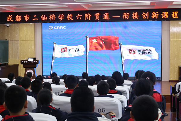 3月30日,成都市二仙桥学校阶梯教室内掌声雷动、气氛热烈。一场以“钢轨上的中国速度”为主题的专题讲座正在精彩开讲。这是成都市二仙桥学校党支部与中车科技园(成都)有限公司党支部联合开展的党建联建共建活动,也是学校“六阶贯通·衔接创新”课程体系的重要一环,为六年级衔接班学子带来一场科技与精神交融的成长盛宴。
