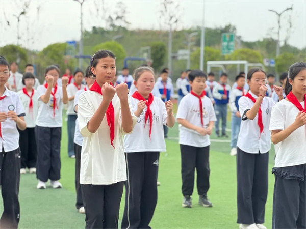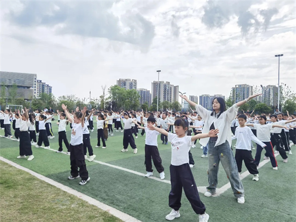 成都东部新区特色自编操《中华美少年》融合传统武术精髓与现代运动韵律,同学们马步稳扎、出拳刚劲、推掌有力,在刚柔并济的动作中,感受中华优秀传统文化的魅力,一招一式尽显中华美少年的飒爽与担当。