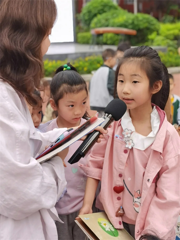 主持人还随机采访了各年级的学生代表。低年级的小朋友兴奋地分享了自己最爱的绘本故事,中年级同学讲述了从阅读中获得的勇气与快乐,高年级同学则结合自己的读书笔记,畅谈名著带来的思考与成长。孩子们真挚的表达、灵动的感悟,赢得了现场阵阵赞许的掌声。