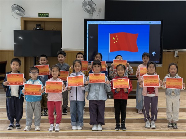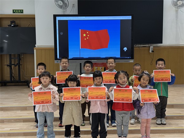 随着主持人的口令,小五班的棉棉、小满、爱宁、岚楠、瑧瑧五位小小旗手精神饱满、步伐整齐,护送国旗至旗杆下。全体师幼面向国旗肃立,唱国歌、行注目礼,神圣的仪式感浸润童心,小小身影满是对祖国的热爱。