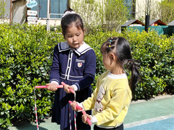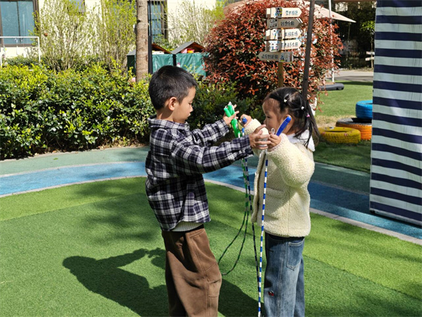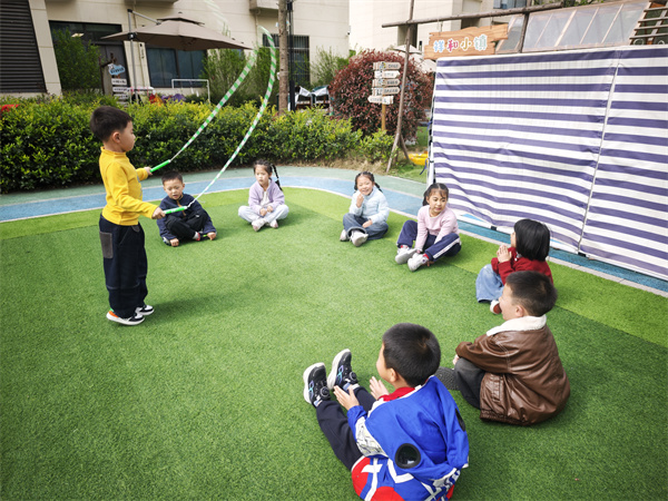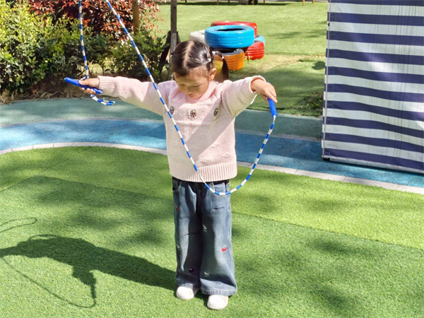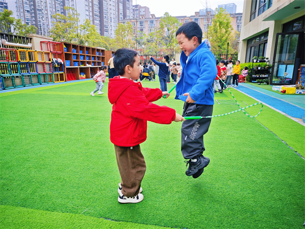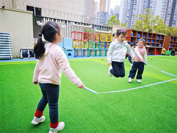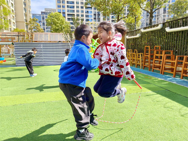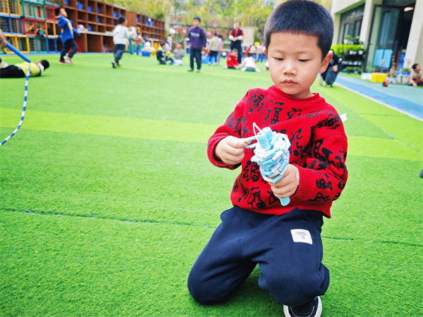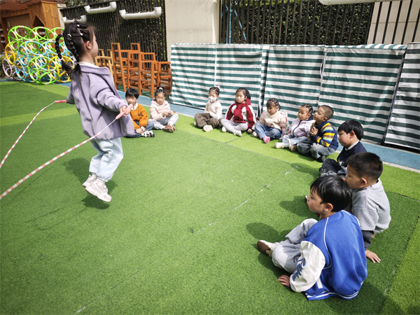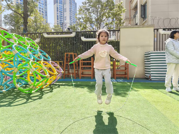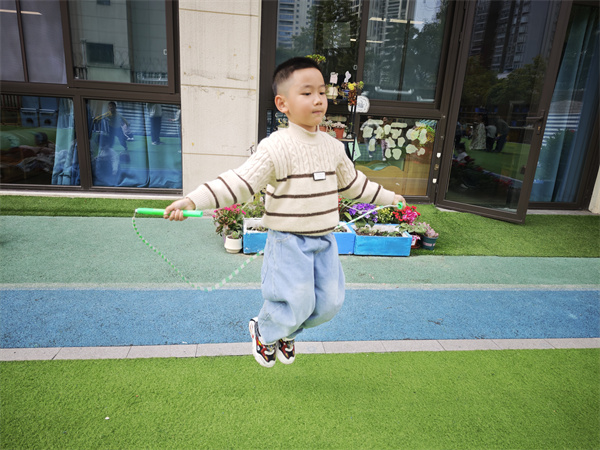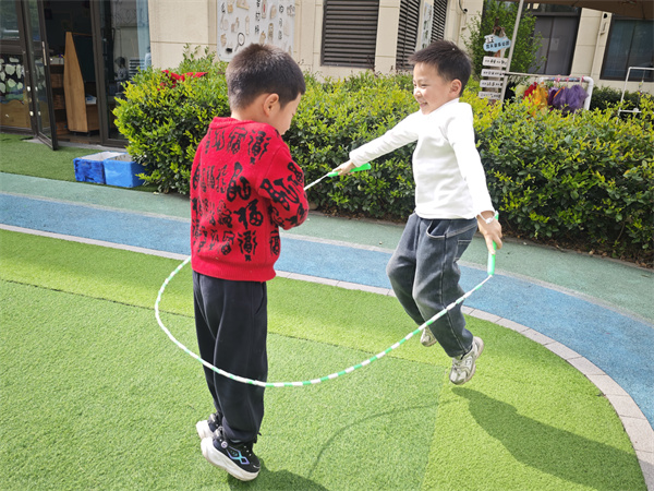 当大部分幼儿掌握基本跳绳技能后,教师基于个体差异与个性化需求,提供多层次、多挑战的练习方式。孩子们不再满足于单人跳,而是自主探索出双人跳、开合跳等花样玩法。在探究过程中,幼儿爱挑战、会思考的特性得到充分激发,勇于探究、乐于创新的学习习惯进一步深化。